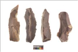 | Description / विवरण | Specimen of flake tools with prominent flaking marks. They are made up of a short flakes with sides trimmed. |