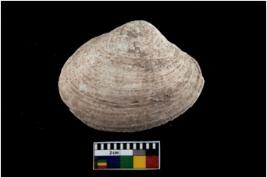 | Description / विवरण | Specimen of a large bivalve marine shell with ground edge. Probably use as spoon. |