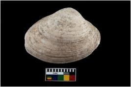 | Description / विवरण | Specimen of a large bivalve marine shell with ground edge. Probably use as spoon. |