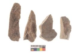 | Description / विवरण | There are n 4 utilized flakes. There are multi directional irregular scar pattern on both dorsal and ventral face of the flakes. two are tapering at one end and two have sharp edges. |