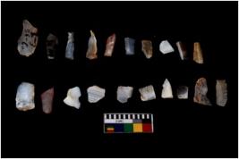 | Description / विवरण | Specimen of flakes tool with prominent flaking marks. It made up of a short flakes with sides trimmed. |
