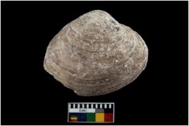 | Description / विवरण | Specimen of a large bivalve marine shell with ground edge. Probably use as spoon. |