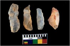 | Description / विवरण | There are n 4 utilized flake cores. There are multi directional irregular scar pattern on them. One has sharp edge and three are tapering at one end. |