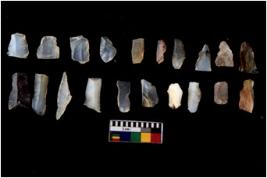 | Description / विवरण | Specimen of flakes tool with prominent flaking marks. It made up of a short flakes with sides trimmed. |