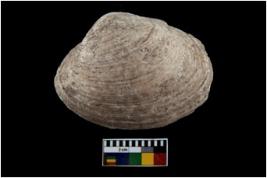 | Description / विवरण | Specimen of a large bivalve marine shell with ground edge. Probably use as spoon. |