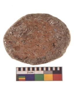 | Description / विवरण | Specimen of ground disc hopscotch made from a red ware. It has jagged edges with sign of chipping. It is rounded in shape. |