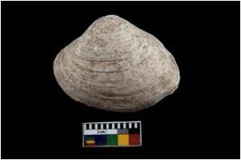 | Description / विवरण | Specimen of a large bivalve marine shell with ground edge. Probably use as spoon. |