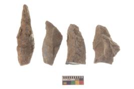 | Description / विवरण | There are n 4 utilized flakes. There are multi directional irregular scar pattern on both dorsal and ventral face of the flakes. three are tapering at one end and one has pen pointed edge. |