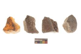 | Description / विवरण | There are n 4 utilized flakes. There are multi directional irregular scar pattern on both dorsal and ventral face of the flakes. three are tapering at one end and one has sharp edges. |