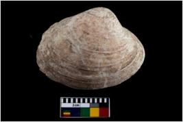 | Description / विवरण | Specimen of a large bivalve marine shell with ground edge. Probably use as spoon. |