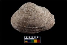 | Description / विवरण | Specimen of a large bivalve marine shell with ground edge. Probably use as spoon. |
