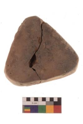 | Description / विवरण | Specimen of triangular terracotta cake. It is hand-made with well levigated clay. It is having rough surface and reddish in colour. It is coarse and well fired. |