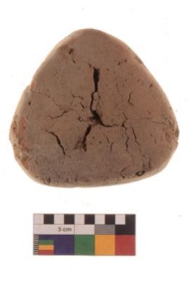 | Description / विवरण | Specimen of triangular terracotta cake. It is hand-made with well levigated clay. It is having rough surface and reddish in colour. It is coarse and well fired. |