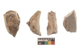 | Description / विवरण | There are n 4 utilized flakes. There are multi directional irregular scar pattern on both dorsal and ventral face of the flakes. three are tapering at one end and one has sharp edge. |