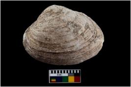 | Description / विवरण | Specimen of a large bivalve marine shell with ground edge. Probably use as spoon. |