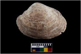 | Description / विवरण | Specimen of a large bivalve marine shell with ground edge. Probably use as spoon. |