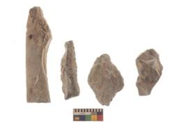 | Description / विवरण | There are n 4 utilized flakes. There are multi directional irregular scar pattern on both dorsal and ventral face of the flakes. two are tapering at one end and two have sharp edges. |