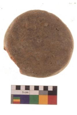 | Description / विवरण | Specimen of roughly rounded terracotta cake. It is hand-made with well-levigated clay. It is having flat rough surface and reddish in colour. It is coarse and ill fired. |
