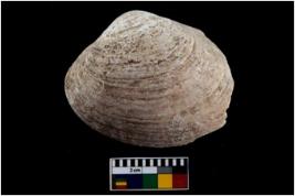 | Description / विवरण | Specimen of a large bivalve marine shell with ground edge. Probably use as spoon. |