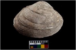 | Description / विवरण | Specimen of a large bivalve marine shell with ground edge. Probably use as spoon. |