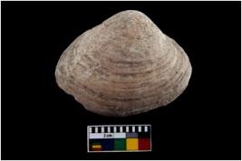 | Description / विवरण | Specimen of a large bivalve marine shell with ground edge. Probably use as spoon. |