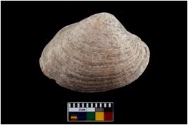 | Description / विवरण | Specimen of a large bivalve marine shell with ground edge. Probably use as spoon. |
