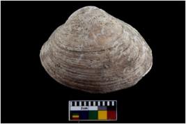 | Description / विवरण | Specimen of a large bivalve marine shell with ground edge. Probably use as spoon. |