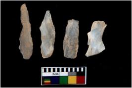 | Description / विवरण | There are n 4 utilized flake cores. There are multi directional irregular scar pattern on them. Three are tapering at one end and one has sharp edge. |