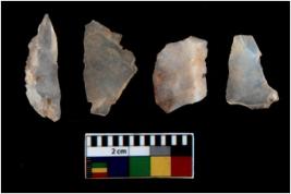 | Description / विवरण | There are n 4 utilized flake cores. There are multi directional irregular scar pattern on them. Three are tapering at one end and one has sharp edge. |