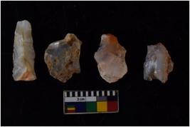 | Description / विवरण | There are n 4 flake cores. All of them are fully fluted flake cores without any trace of crested ridge flakes. Some are tapering at one end and some have sharp edges. |