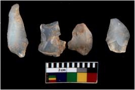 | Description / विवरण | There are n 4 utilized flake cores. There are multi directional irregular scar pattern on them. One is tapering at one end and three have blunted edges. |