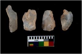 | Description / विवरण | There are n 4 utilized flake cores. There are multi directional irregular scar pattern on them. All of them are tapering at one end. |