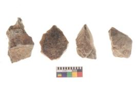 | Description / विवरण | There are n 4 utilized flakes. There are multi directional irregular scar pattern on both dorsal and ventral face of the flakes. three are tapering at one end and one has sharp edge. |
