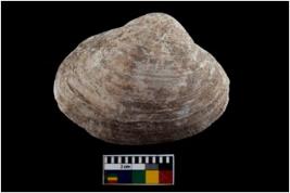 | Description / विवरण | Specimen of a large bivalve marine shell with ground edge. Probably use as spoon. |