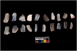 | Description / विवरण | Specimen of flakes tool with prominent flaking marks. It made up of a short flakes with sides trimmed. |