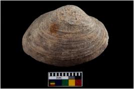 | Description / विवरण | Specimen of a large bivalve marine shell with ground edge. Probably use as spoon. |