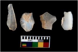 | Description / विवरण | There are n 4 utilized flake cores. There are multi directional irregular scar pattern on them. One is tapering at one end and three have blunted edges. |