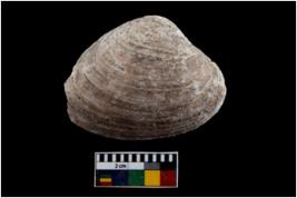 | Description / विवरण | Specimen of a large bivalve marine shell with ground edge. Probably use as spoon. |