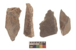 | Description / विवरण | There are n 4 utilized flakes. There are multi directional irregular scar pattern on both dorsal and ventral face of the flakes. three are tapering at one end and one has sharp edge. |