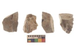 | Description / विवरण | There are n 4 utilized flakes. There are multi directional irregular scar pattern on both dorsal and ventral face of the flakes. two are tapering at one end and two have sharp edges. |