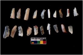 | Description / विवरण | Specimen of flakes tool with prominent flaking marks. It made up of a short flakes with sides trimmed. |