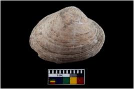 | Description / विवरण | Specimen of a large bivalve marine shell with ground edge. Probably use as spoon. |