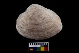 | Description / विवरण | Specimen of a large bivalve marine shell with ground edge. Probably use as spoon. |