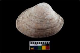 | Description / विवरण | Specimen of a large bivalve marine shell with ground edge. Probably use as spoon. |