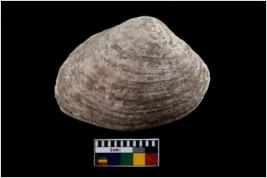 | Description / विवरण | Specimen of a large bivalve marine shell with ground edge. Probably use as spoon. |