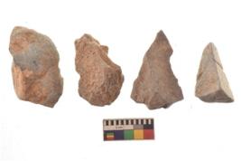 | Description / विवरण | There are n 4 utilized flakes. There are multi directional irregular scar pattern on both dorsal and ventral face of the flakes. three are tapering at one end and one has sharp edge. |