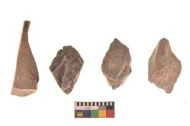 | Description / विवरण | There are n 4 utilized flakes. There are multi directional irregular scar pattern on both dorsal and ventral face of the flakes. three are sharp at one end and one has pointed edge. |
