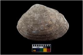 | Description / विवरण | Specimen of a large bivalve marine shell with ground edge. Probably use as spoon. |