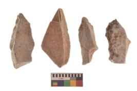 | Description / विवरण | There are n 4 utilized flakes. There are multi directional irregular scar pattern on both dorsal and ventral face of the flakes. three are tapering at one end and one has sharp edge. |