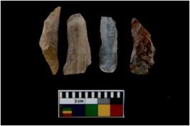 | Description / विवरण | There are n 4 utilized flake cores. Out of them three are made up of Chalcedony and one is made up of Chert. There are multi directional irregular scar pattern on them. Three are tapering at one end and one has sharp edge. |
